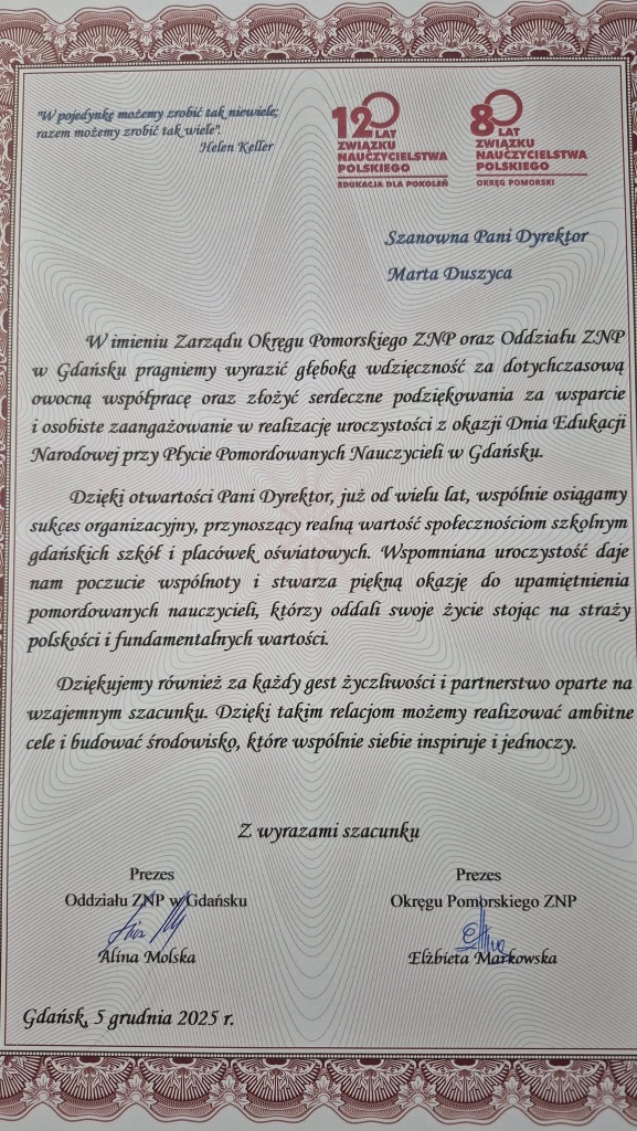 W dniu dzisiejszym Pani Dyrektor Marta Duszyca oraz Pani Wicedyrektor Danuta Gohr wzięly udział w Ogólnopolskich Obchodach Jubileuszu 120-lecia ZNP oraz 80-lecia ZNP Okręgu Pomorskiego.